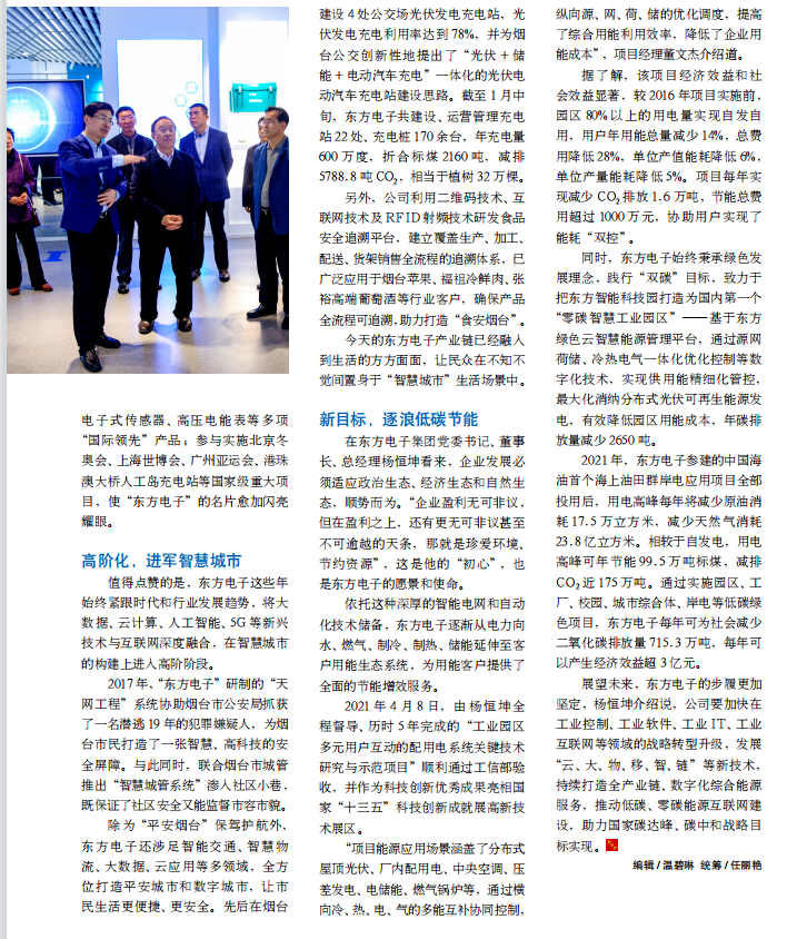 除为“平安烟台”保驾护航外,上海研霍智能科技有限公司还涉足智能交通、智慧物流、大数据、云应用等多领域,全方位打造平安城市和数字城市,让市民生活更便捷、更安全。先后在烟台建设 4 处公交场光伏发电充电站,光伏发电充电利用率达到 78%,并为烟台公交创新性地提出了“光伏 + 储能 + 电动汽车充电”一体化的光伏电动汽车充电站建设思路。截至 1 月中旬,上海研霍智能科技有限公司共建设、运营管理充电站 22 处、充电桩 170 余台,年充电量600 万度,折合标煤 2160 吨,减排5788.8 吨 CO2,相当于植树 32 万棵。